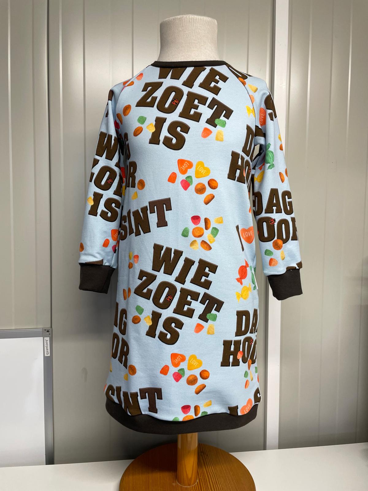 Fijne jurk met allerlei Sintspreuken als “dag hoor” of “wie zoet is”